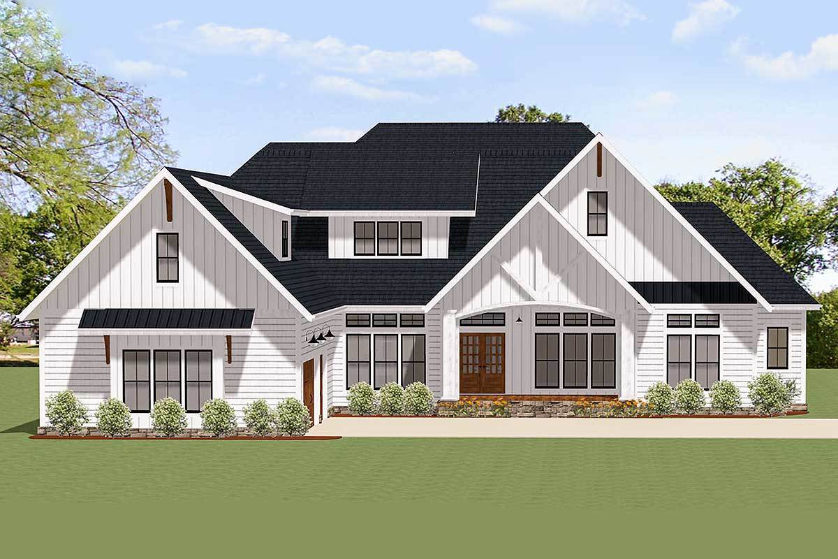 The modern farmhouse is an excellent example of the farmhouse's evolution, which is a style that has been around since early settlers arrived in the 1700s. The modern farmhouse is exactly what it sounds like: Inside farmhouse floor plans, the kitchen takes precedence and invites people to gather together. And given just the right amount of detail. Classic plans typically include a welcoming front porch or wraparound porch, dormer windows on the second floor, shutters, a gable roof, and simple lines. Farmhouse style house plans are timeless and remain popular today. Symmetrical gables often are present, adding a pleasing sense of balance. Modern farmhouse plans present streamlined versions of the style with clean lines and open floor plans. But there's much more than just mixing older and newer elements. Today's modern farmhouse plans add to this classic style by showcasing sleek lines, contemporary open layouts, and large windows. A modernized version of the classic farmhouse. Farmhouse plans are usually two stories, with plenty of space upstairs for bedrooms. The typical modern farmhouse house plan presents a porch for outdoor living, and a second story with dormers for additional light.